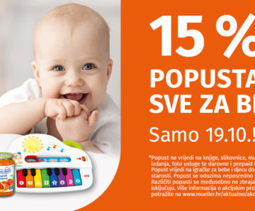 Ne propustite Müllerov dan beba i utorak 19.10. ostvarite 15% popusta na cijeli baby asortiman*. *Popust se odnosi na cijeli