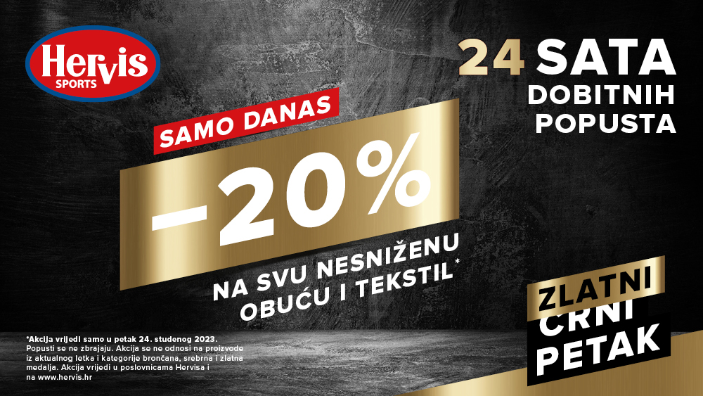*Akcija vrijedi samo u petak 24. studenog 2023. Popusti se ne zbrajaju. Akcija se ne odnosi na proizvode iz aktualnog letka i kategorije brončana, srebrna i zlatna medalja. Akcija vrijedi u poslovnicama Hervisa i na www.hervis.hr