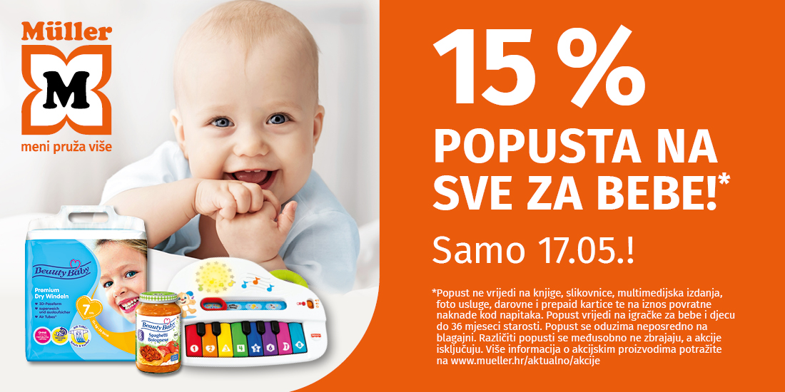 Samo danas, 17.05. dođite na Müllerov dan beba i ostvarite 15% popusta na cijeli baby asortiman*.