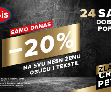 -20%* NA SVU NESNIŽENU OBUĆU I TEKSTIL *Akcija vrijedi samo u petak 24. studenog 2023. Popusti se ne zbrajaju. Akcija