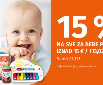 Samo 21.11.2023. ostvarite 15% popusta na cijeli baby asortiman. *15% popusta se odnosi na cijeli baby asortiman na odjelu drogerije