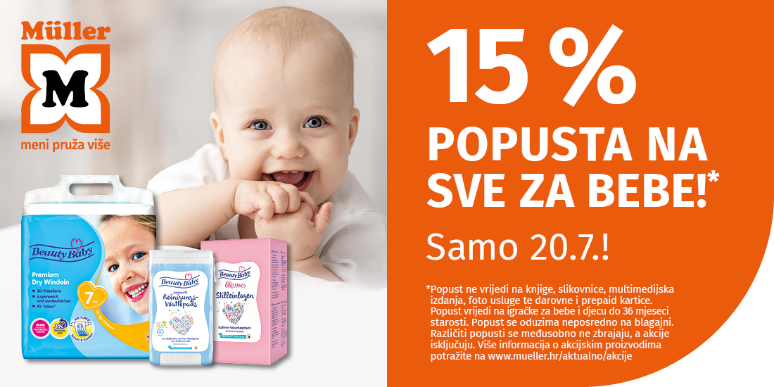 U utorak 20.07. u Mülleru se održava omiljeni „Dan beba“ kada svim roditeljima nudimo 15% popusta na cijeli baby asortiman*.