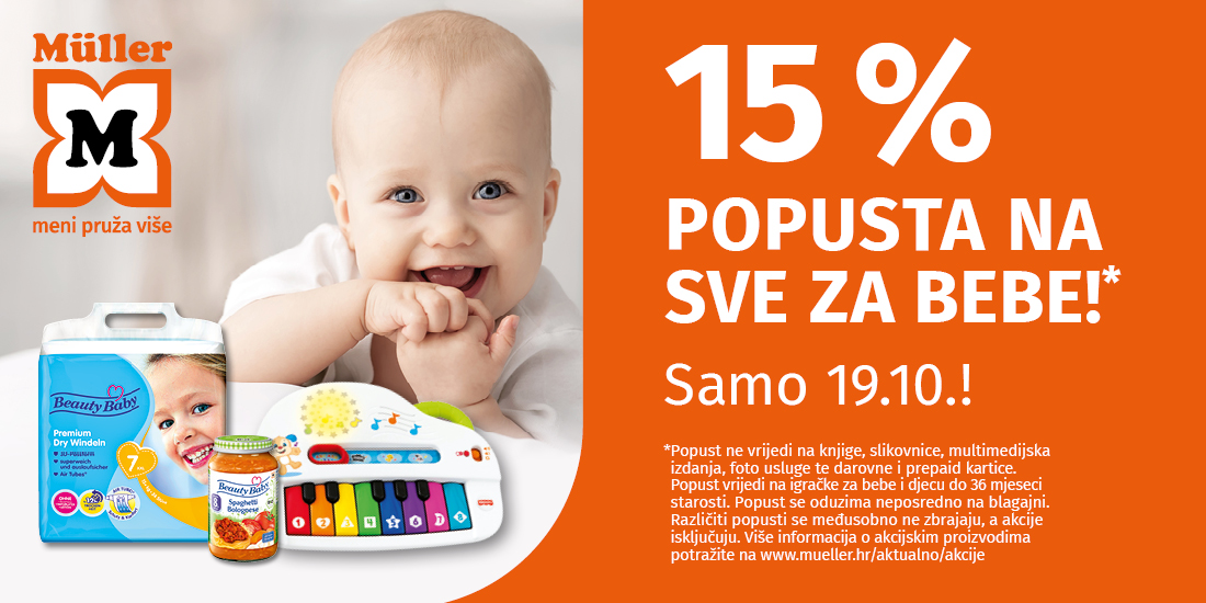 Ne propustite Müllerov dan beba i utorak 19.10. ostvarite 15% popusta na cijeli baby asortiman*.