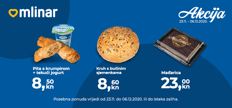 Stigla je nova dvotjedna akcija i donosi ti čak tri razloga zbog kojih ćeš htjeti odmah svratiti u Mlinar. Neodoljivi Kruh s bučinim sjemenkama (500 g) odlično upotpunjuje svaki obrok, a tijekom ove akcije možeš ga potražiti po cijeni od 8,60 kn. Pita s krumpirom (150 g) već je osvojila srca mnogih kupaca, a u kombinaciji s tekućim jogurtom Meggle (2,8% M.M., 180 g) možeš ju kupiti po cijeni od 8,50 kn. Ne kaže se bez razloga da šećer dolazi na kraju – tijekom ove akcije potraži svoju omiljenu Mađaricu po akcijskoj cijeni od 23,00 kn i podijeli ju sa svojim najbližima.