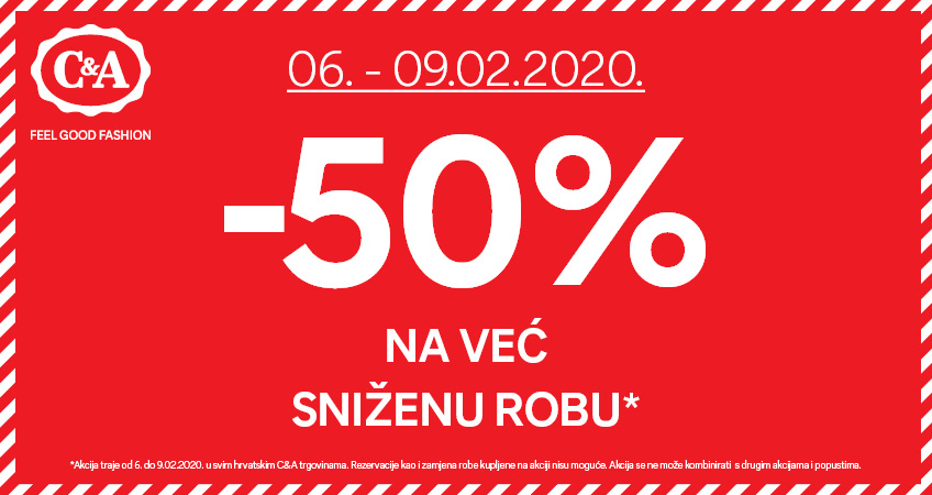 Super prilika u C&A veljača 5, 2020 Posebne ponude Super prilika za odličan shopping čeka vas u trgovini C&A, -50% na već sniženu robu! Akcija traje od 06.02 do 09.02.2020.